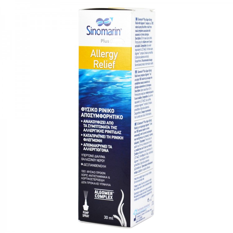 Το Sinomarin Plus Algae Allergy Relief είναι ένα 100% φυσικό προϊόν που χαρίζει ανακούφιση από τα ρινικά συμπτώματα που σχετίζονται με την εποχική ή τη χρόνια αλλεργική ρινίτιδα.Απομακρύνει τα αλλεργιογόνα τα οποία μπορούν να οδηγήσουν ή να επιδεινώσουν τα συμπτώματα της αλλεργικής ρινίτιδας.