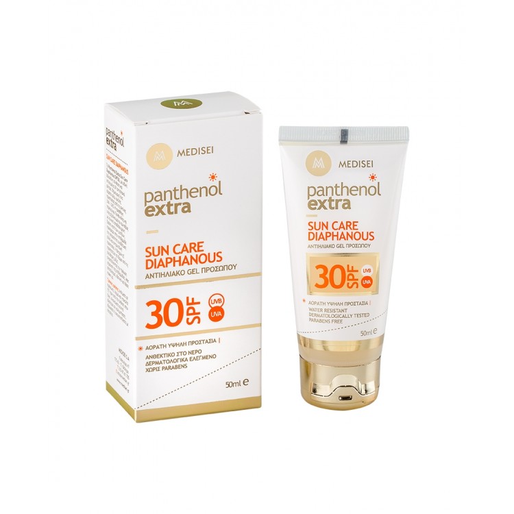 Εμπιστευτείτε το αντηλιακό gel προσώπου, Panthenol Extra Sun Care Diaphanous SPF30, που με την ειδική βελούδινη σύνθεση και τα επιλεγμένα UV αντιηλιακά φίλτρα, δημιουργεί ένα αόρατο φιλμ υψηλής προστασίας από τις ακτίνες UVA/UVB. Η προσθήκη παραγώγου πανθενόλης και ενός εξειδικευμένου αμινοξέος με κλινικά αποδεδειγμένη δράση κατά των ρυτίδων, προσφέρει στην επιδερμίδα, την απαραίτητη ενυδάτωση αλλά και αντιρυτιδική προστασία. Η βιταμίνη Ε προστατεύει το δέρμα από τις ελεύθερες ρίζες αναστέλλοντας την πρόωρη γήρανση της επιδερμίδας. Ματ αποτέλεσμα, ιδανικό για βάση make up.